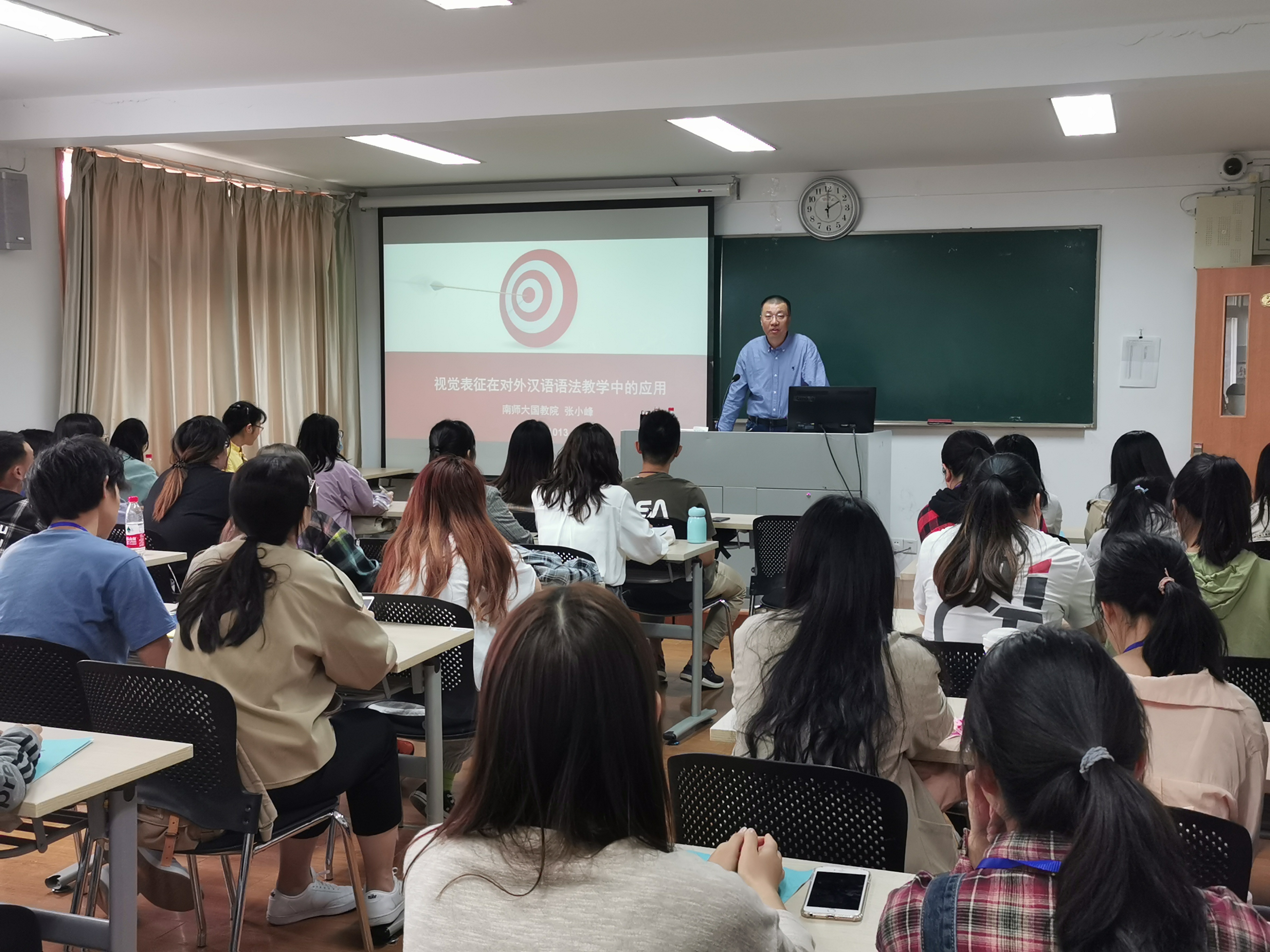 10月13日下午,海外教育学院邀请南京师范大学国际文化教育学院副院长张小峰博士做了题为“视觉表征在对外汉语语法教学中的应用”的学术报告,海外教育学院教师、文学院2018级汉语国际教育专业40余名见习生和4名指导教师共同到场聆听。