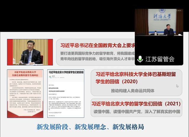 12月15日下午,国际交流处举办外事工作专题培训。江苏省高教学会外国留学生教育管理研究委员会副理事长兼秘书长张海军教授应邀作“加强来华留学内涵建设,推进教育对外开放质量提升”线上专题讲座。讲座由国际交流处副处长、海外教育学院副院长赵娟主持,国际交流处全体工作人员、二级学院外事秘书参加。