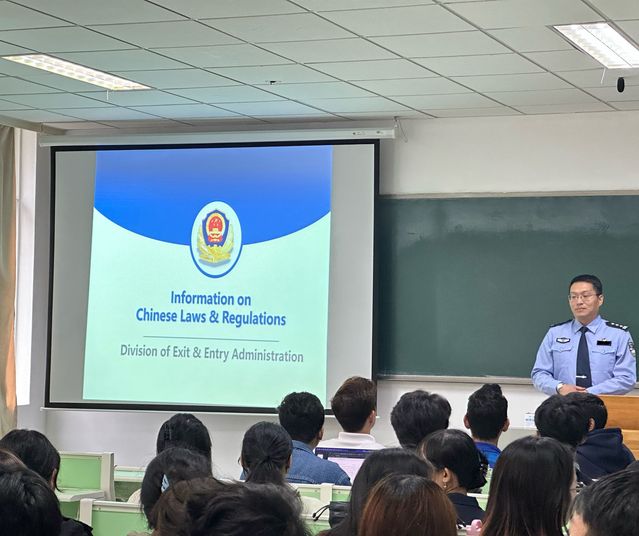 南京市公安局出入境管理支队警官用英文依次介绍了《中华人民共和国宪法》《中华人民共和国治安管理处罚法》《中华人民共和国出境入境管理法》《中华人民共和国道路交通安全法》中的重要内容,并结合案例,围绕外国人入境出境、停留居留、交通安全、网络安全等方面进行了详细讲解。其间,警官与留学生们积极互动,要求留学生们加强对中国法律法规的学习,自觉遵守中国法律法规和学校各项规章制度。